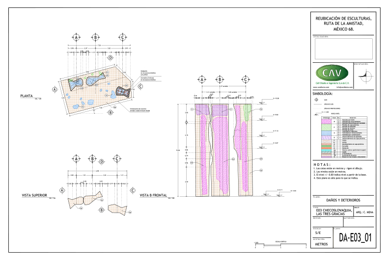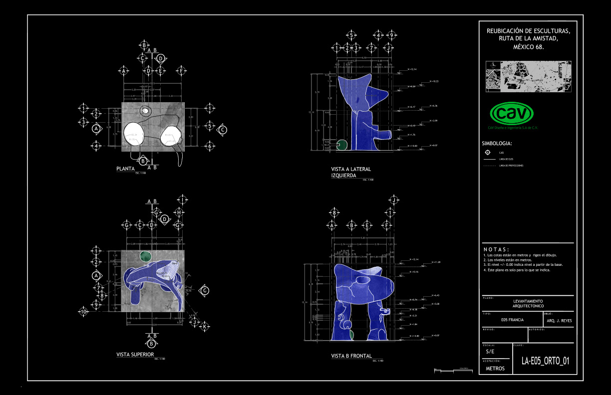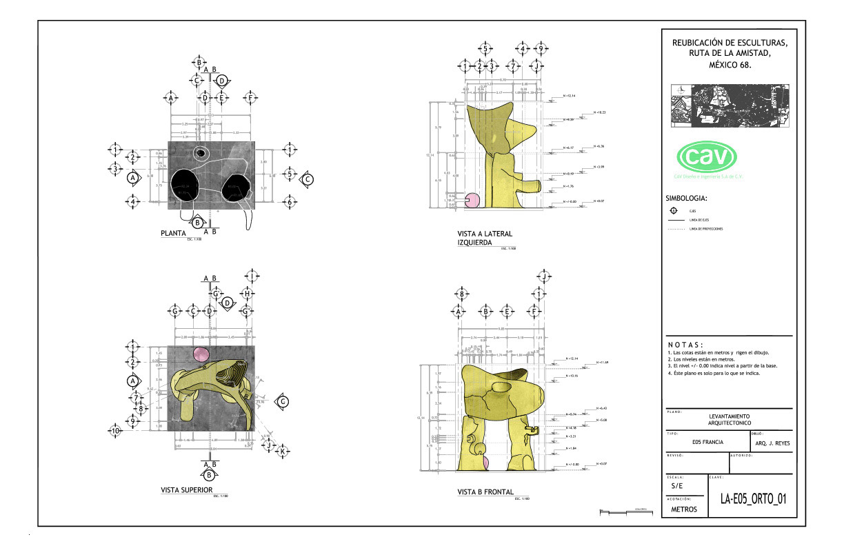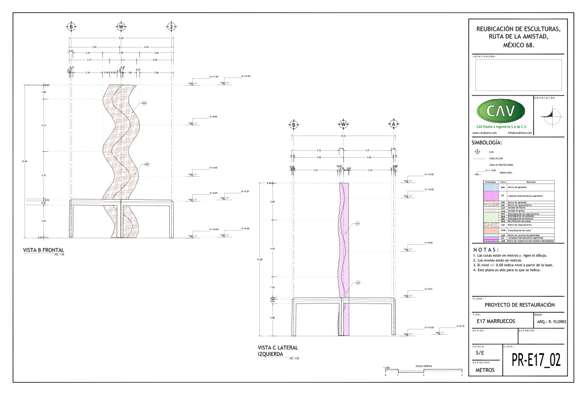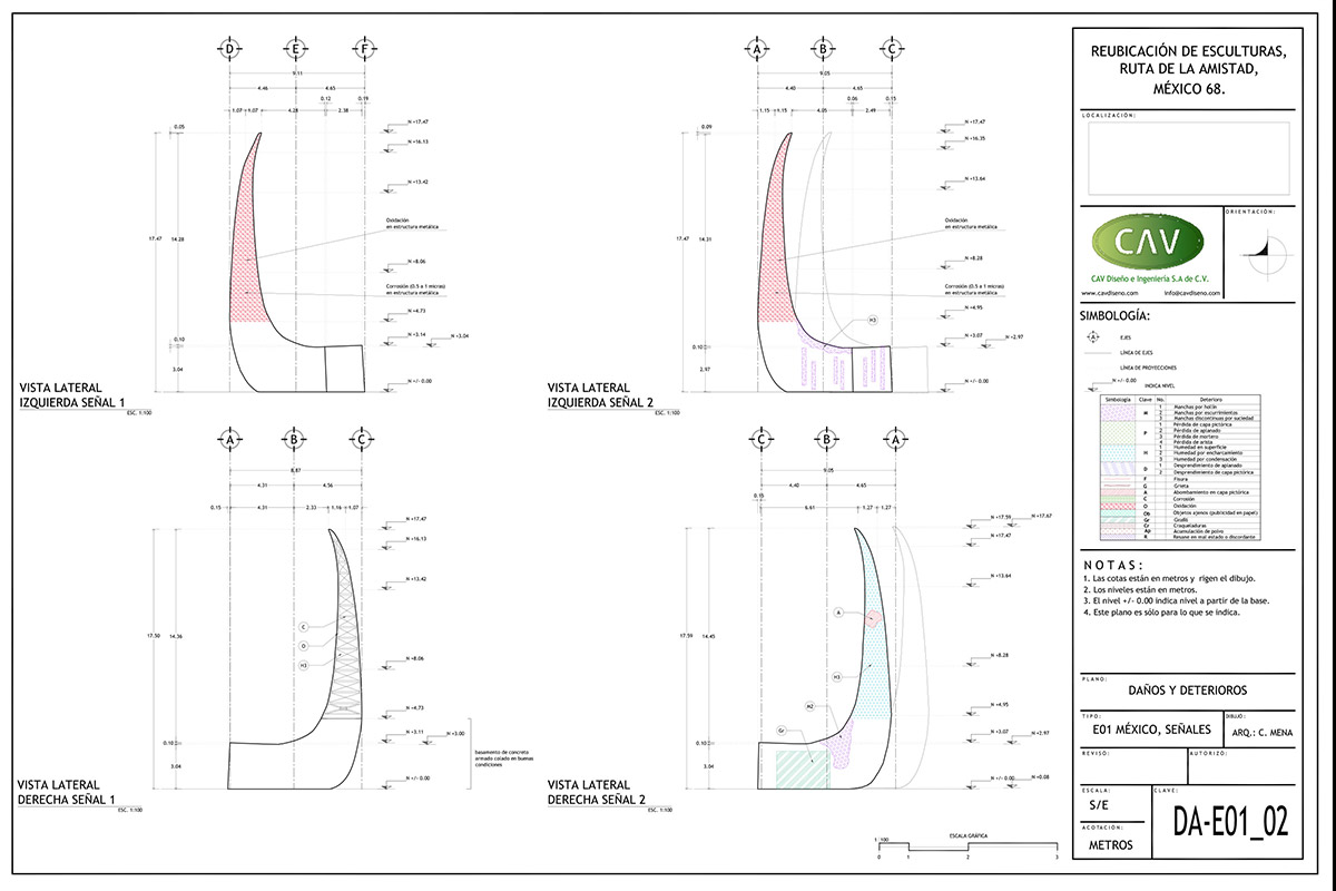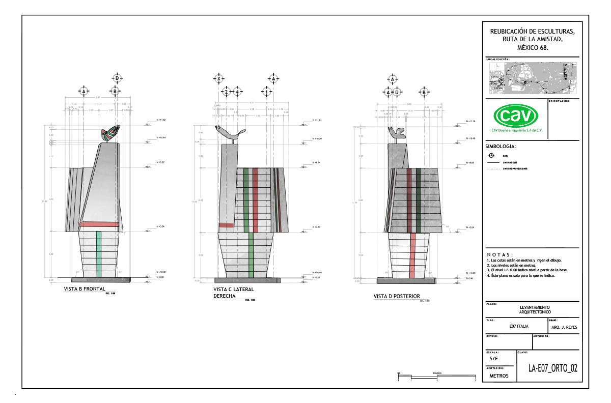 El acervo cultural “Ruta de la amistad”, que conmemora los Juegos Olímpicos de México celebrados en 1968, es un corredor de 17 km de longitud con 22 esculturas monumentales donadas por países de los 5 continentes. Este magnífico complejo quedó en total abandono durante 25 años, en los que afrontó un sinnúmero de agresiones que le provocaron severas afectaciones por el rápido crecimiento urbano. CAV elaboró el proyecto ejecutivo y los estudios preliminares para la reubicación de 10 esculturas, también conocidas como “Estaciones”, de las cuales se reubicaron 8, a saber: Señales, de México; El ancla, de Suiza; Las tres gracias, de la República Checa; Sol, de Japón; Janus, de Australia; Muro articulado, de Austria-Estados Unidos; Puerta de paz, de Israel y Charamusca africana, de Marruecos.