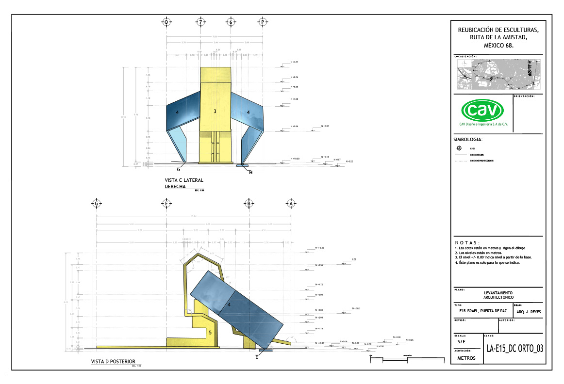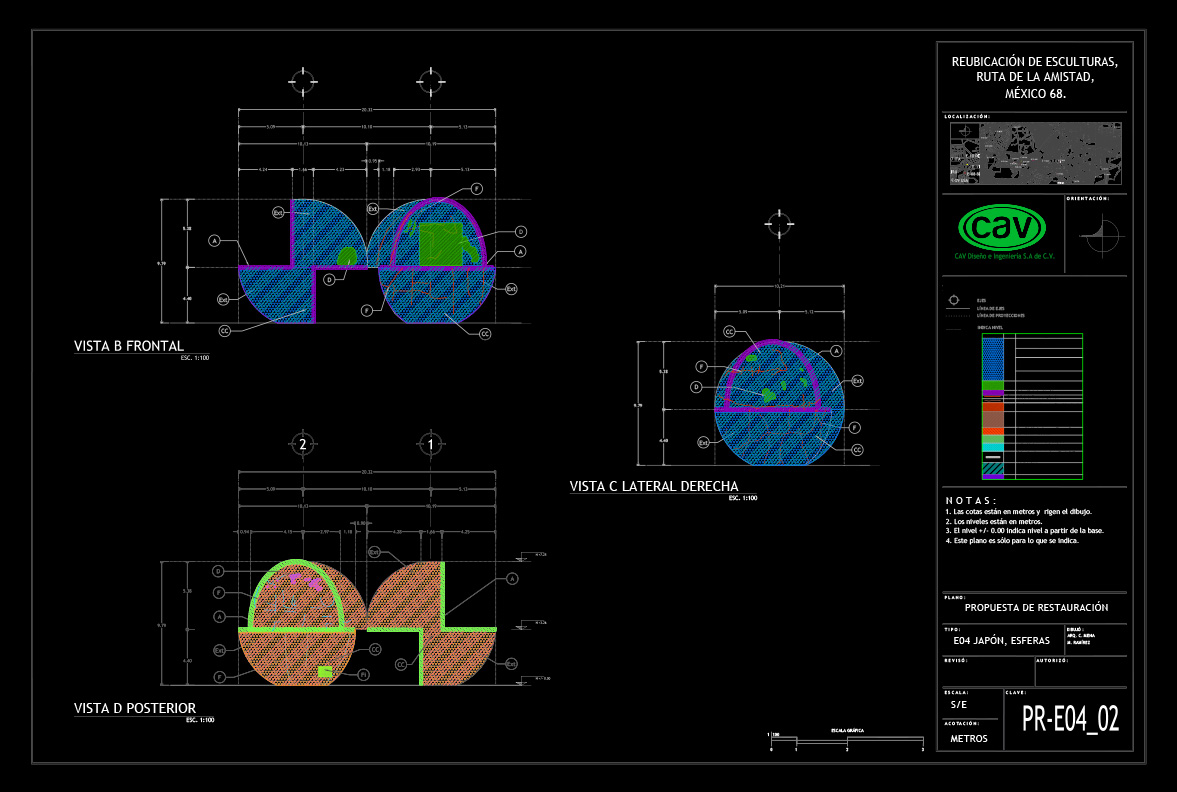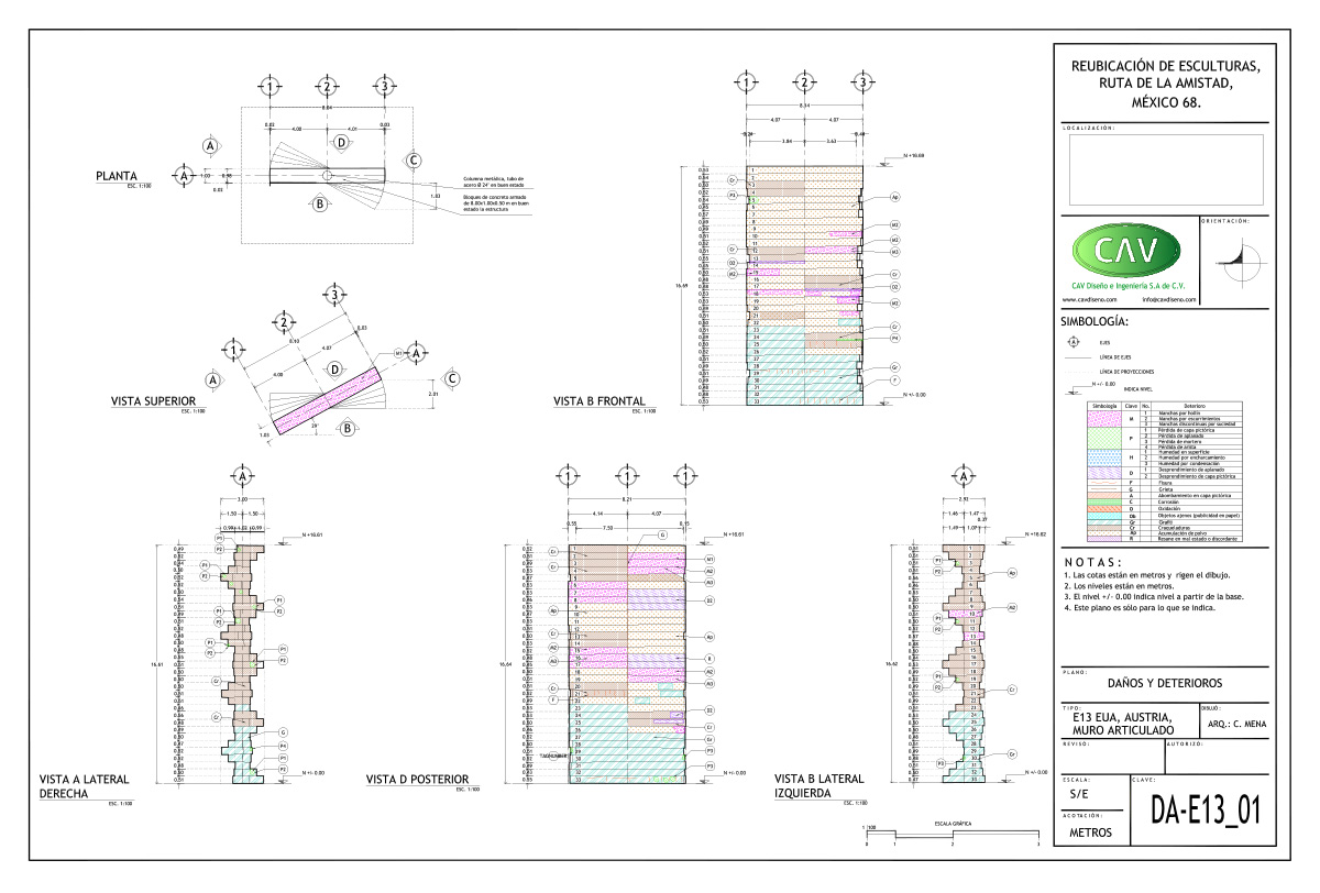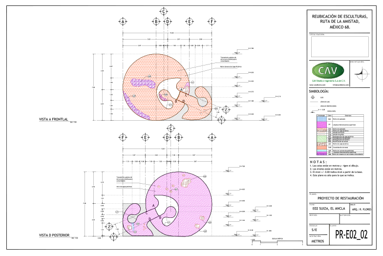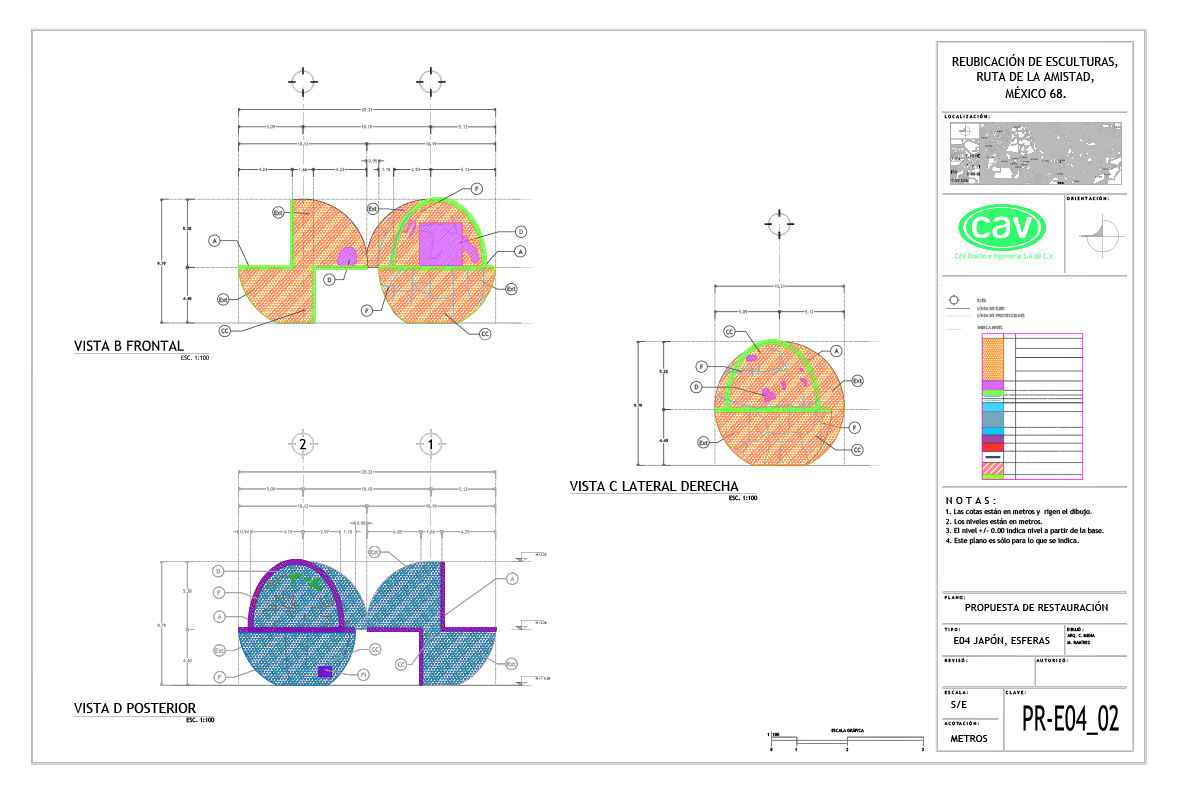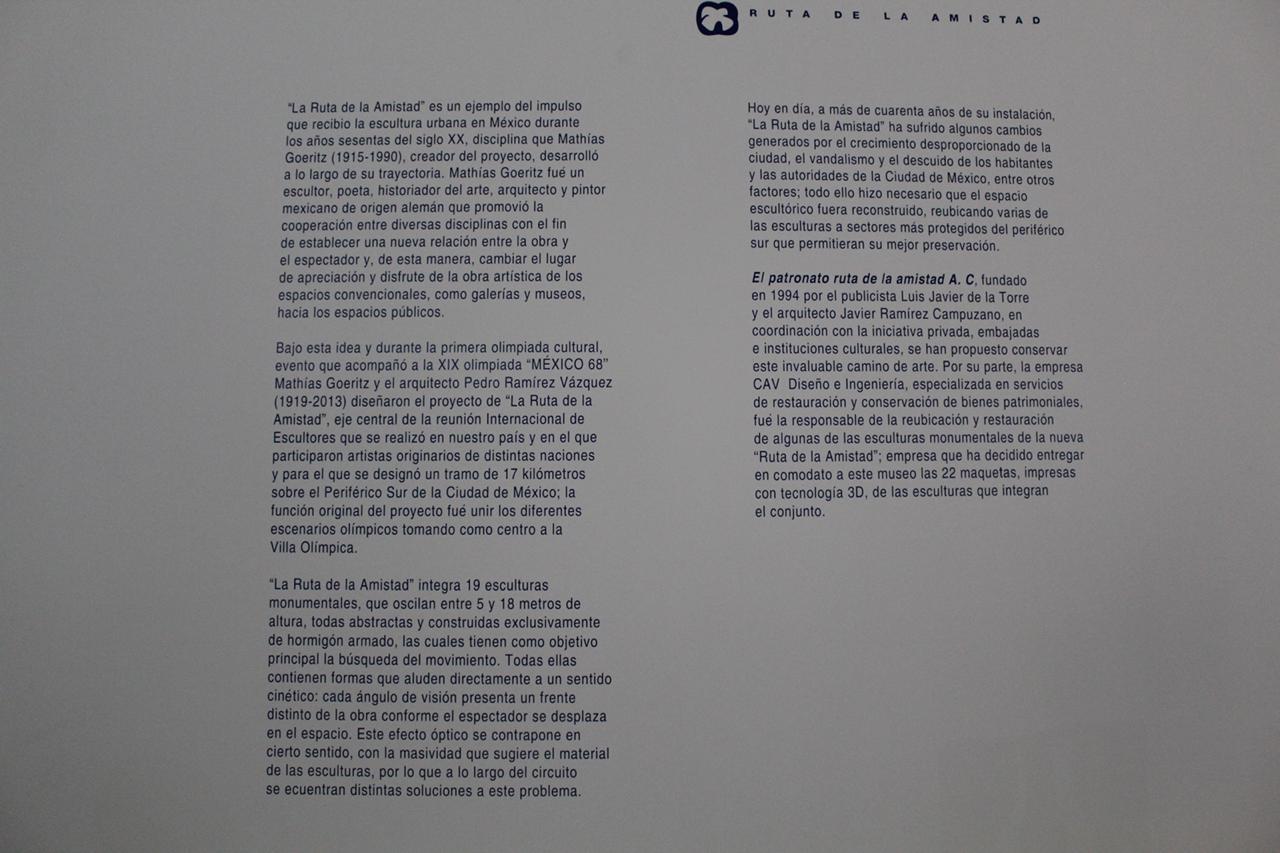 El acervo cultural “Ruta de la amistad”, que conmemora los Juegos Olímpicos de México celebrados en 1968, es un corredor de 17 km de longitud con 22 esculturas monumentales donadas por países de los 5 continentes. Este magnífico complejo quedó en total abandono durante 25 años, en los que afrontó un sinnúmero de agresiones que le provocaron severas afectaciones por el rápido crecimiento urbano. CAV elaboró el proyecto ejecutivo y los estudios preliminares para la reubicación de 10 esculturas, también conocidas como “Estaciones”, de las cuales se reubicaron 8, a saber: Señales, de México; El ancla, de Suiza; Las tres gracias, de la República Checa; Sol, de Japón; Janus, de Australia; Muro articulado, de Austria-Estados Unidos; Puerta de paz, de Israel y Charamusca africana, de Marruecos.